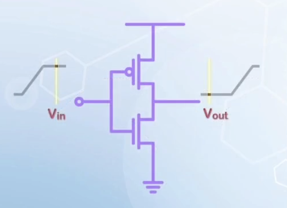 - When input is high, NMOSFET is on, and PMOSFET is off