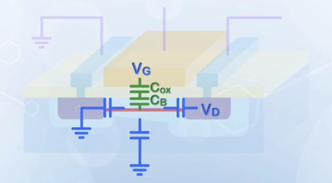In terms of electrostatic control, when the MOSFET is turned off, the region below the gate is depleted, and is considered insulator. The gate, source, drain and body terminals can only control the potential of the region through capacitive coupling. The potential at any point in the depletion region is the weighted sum of the four terminal voltages, and the relative influence of the terminals are determined by the associated capacitances.