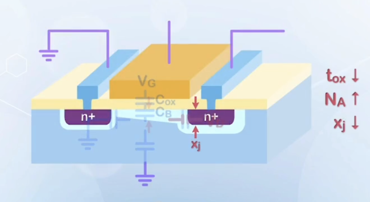 by reducing oxide thickness- The effect of source / drain contributed charge on