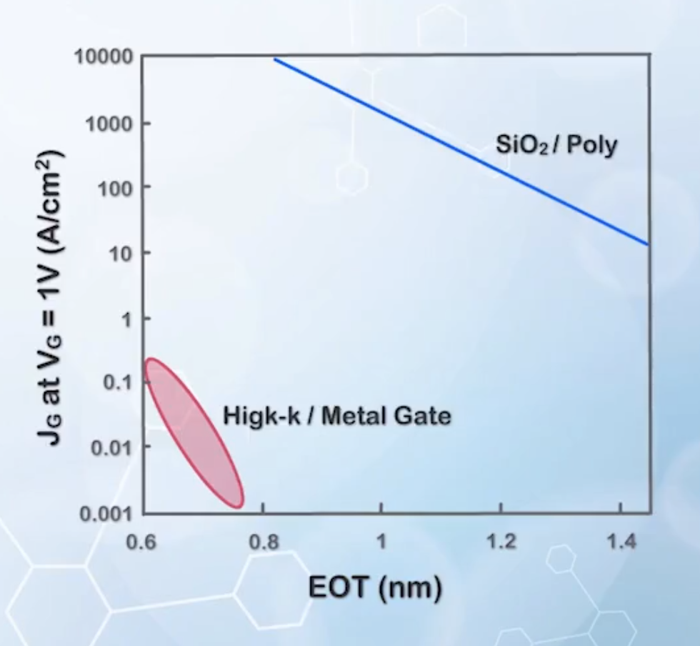 By switching to such high-k / metal gate structure, we can achieve a lower EOT with lower gate leakage current. This is why it becomes the dominant MOSFET technology in spite of its high cost.