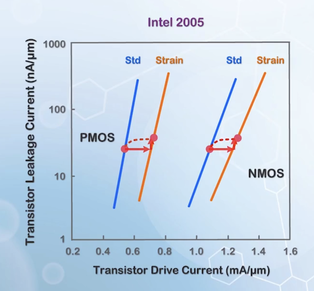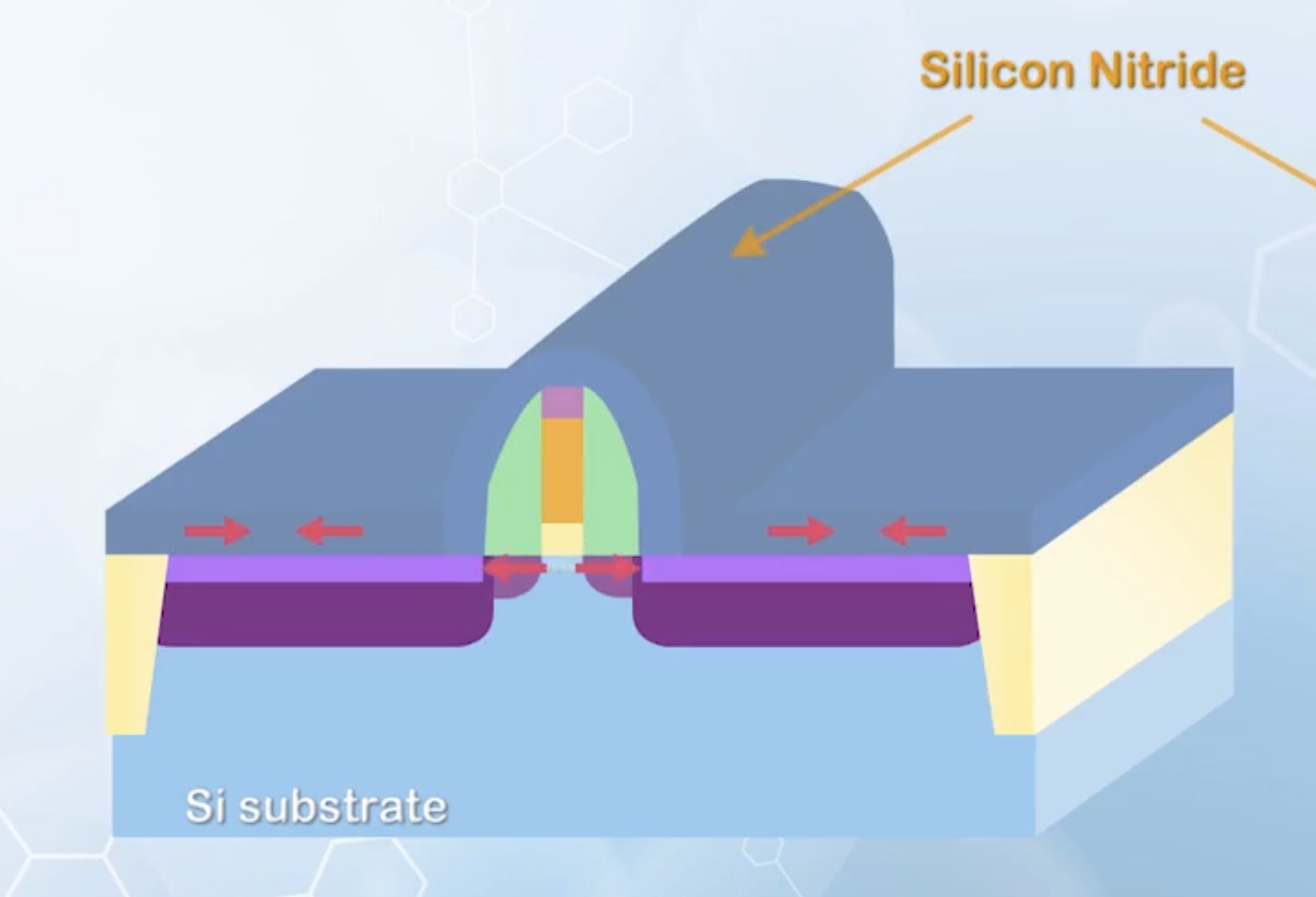 Strain engineering is introduced to increase the channel carrier mobility without changing its structure or using a new material system. Understanding strain engineering requires knowledge of quantum mechanics and the energy momentum ot E-k space, which is not covered in this course. Instead, a more intuitive explanation is given here, which may not be entirely correct in strict physics sense.
