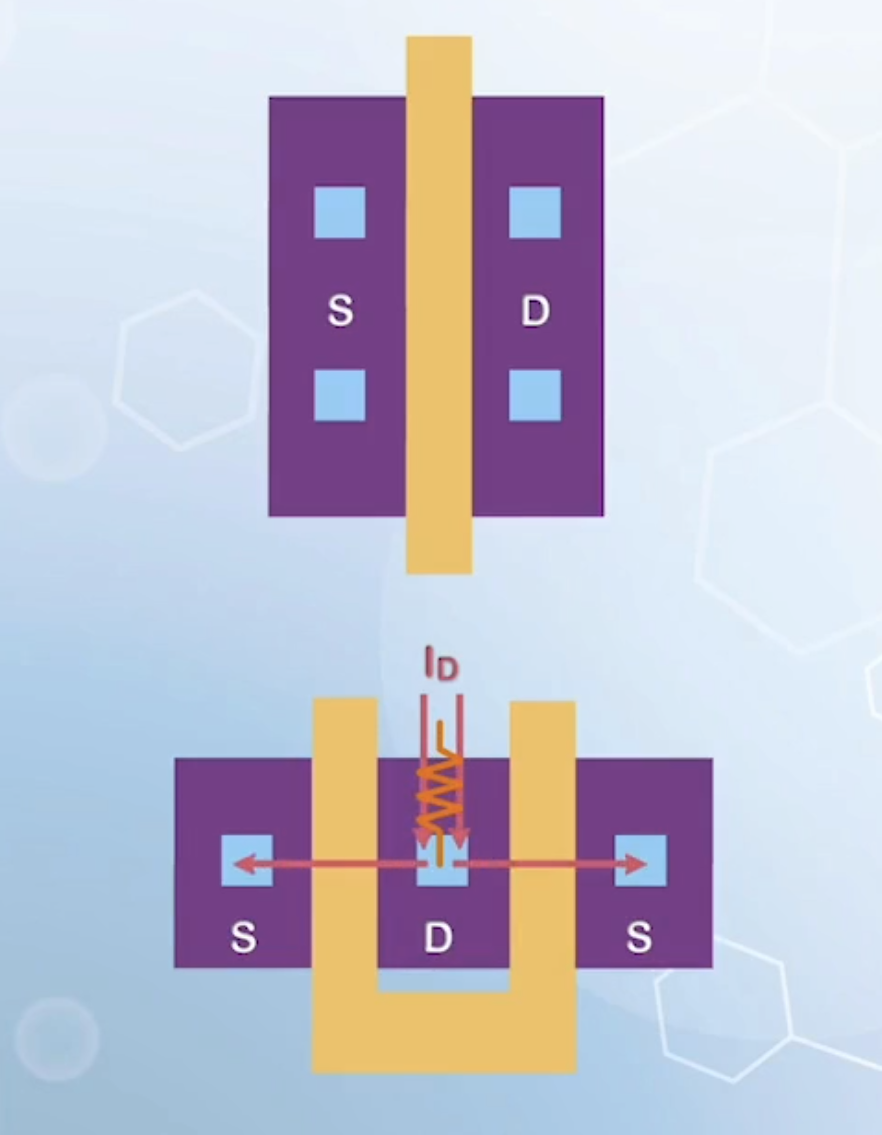 The parasitic source and drain capacitance can be reduced by using the parallel layout, as the drain region can be shielded by two transistors