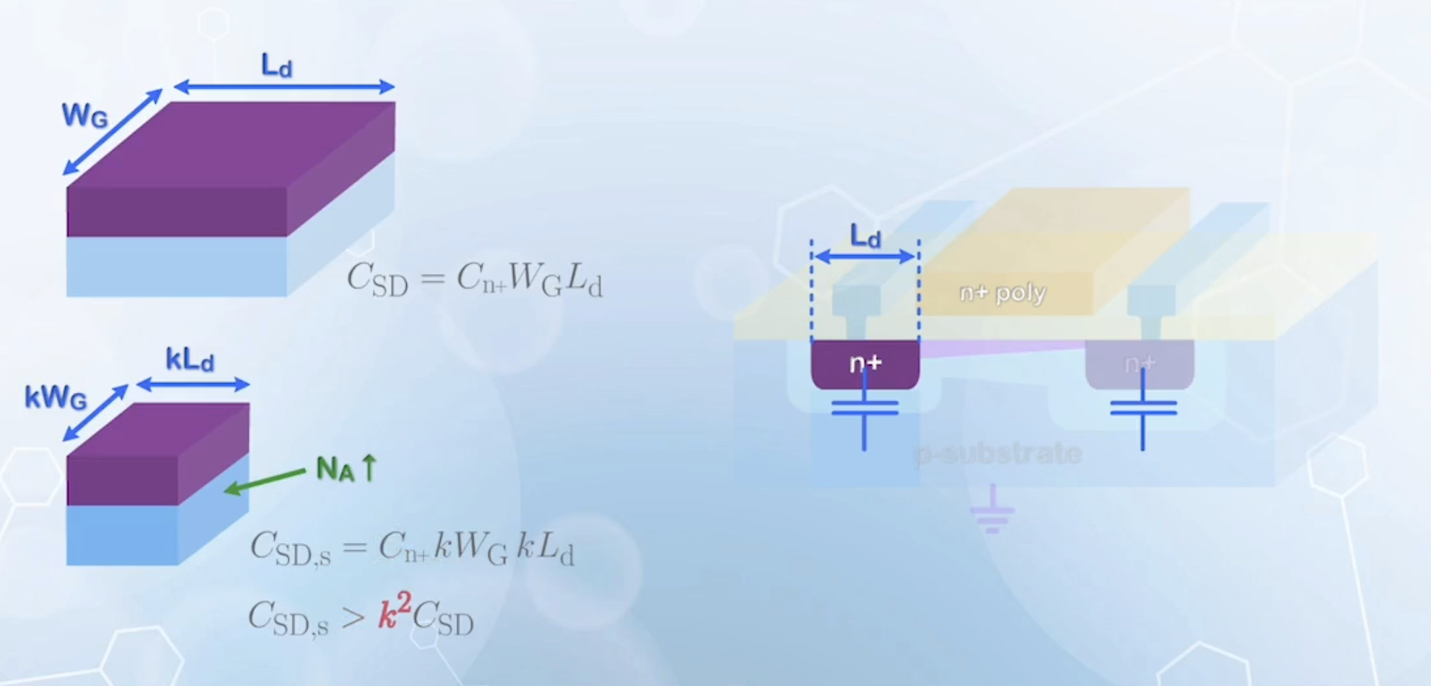 - The increase in the substrate doping will cause an increase in the junction capacitance, offsetting some of the reduction of the source and drain parasitic capacitance due to scaling